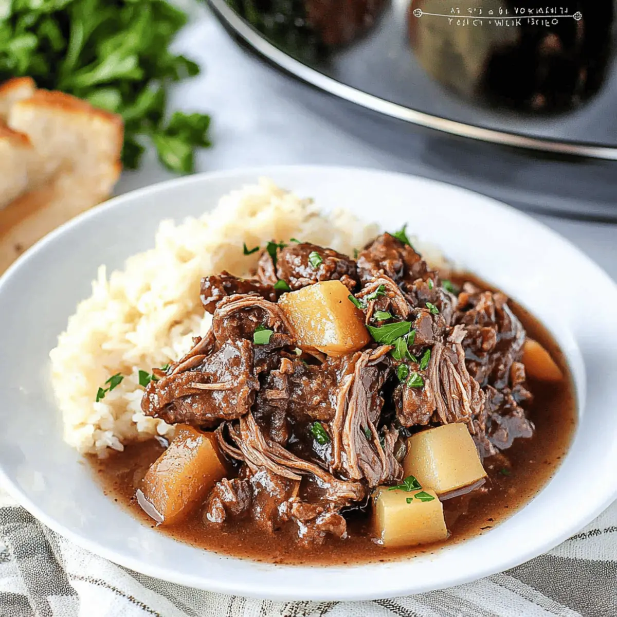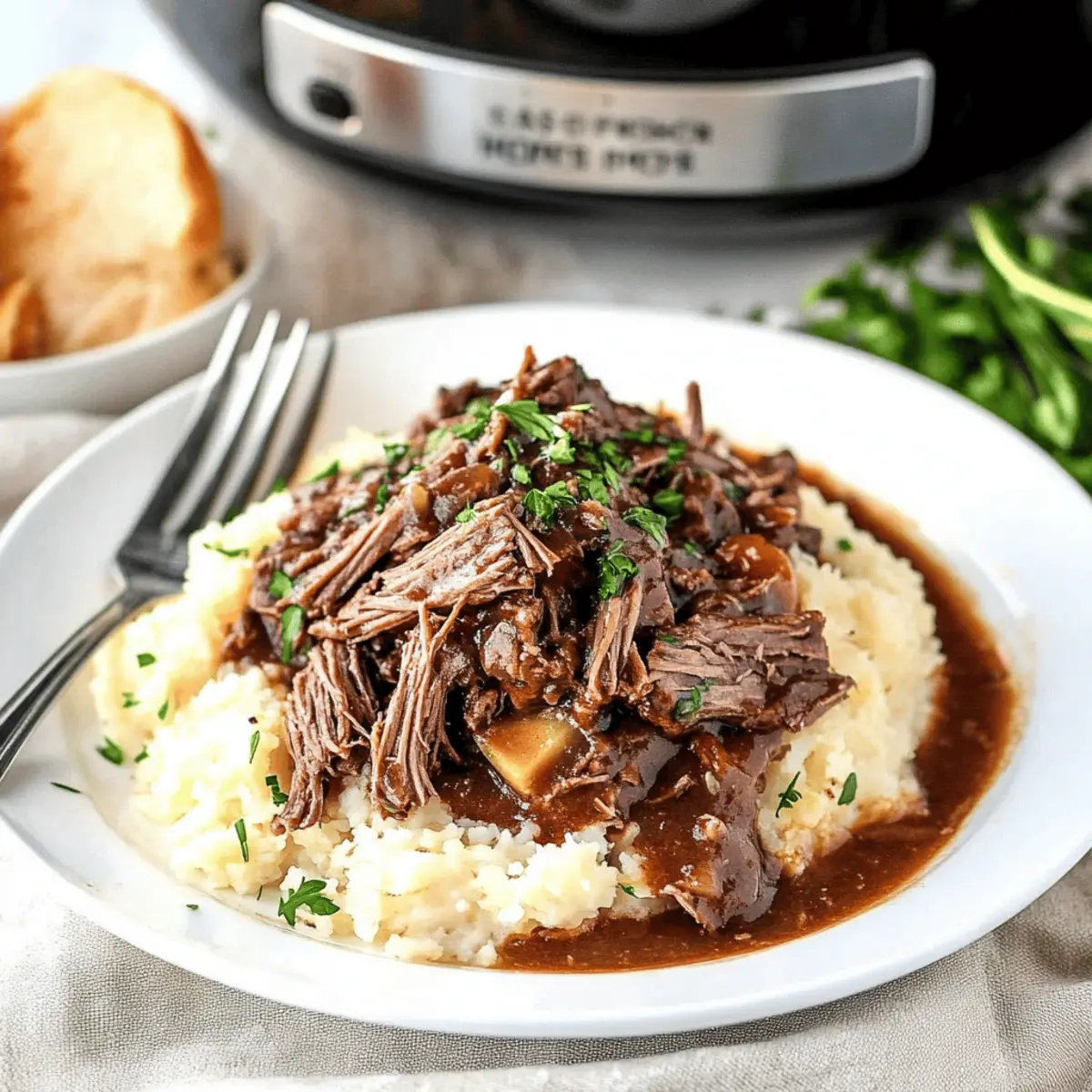 To serve, take a slice of that golden garlic toast and pile it high with creamy mashed potatoes. Top it off with the beautifully shredded beef and a drizzle of the savory au jus from the cooker.